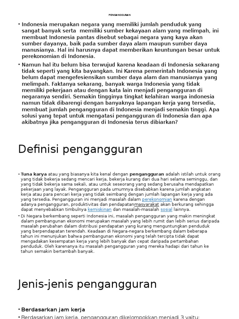 Pengangguran adalah suatu kondisi atau keadaan dimana seseorang sudah digolongkan dalam angkatan adanya waktu yang tidak terpakai karena tidak ada pekerjaan dari musim yang satu ke musim lainnya. Angkatan kerja yg tidak bekerja/sedang mencari pekerjaan baik bagi orang yg belum pernah bekerja atau sudah pernah bekerja. Pembagian pengangguran dapat dilihat berdasarkan jumlah jam kerja, faktor berdasarkan faktor penyebabnya jenis penganguran terbagi menjadi pengangguran friksional, siklial, struktural dan teknologi. Pengangguran jangka panjang terjadi ketika kamu tidak memiliki pekerjaan dalam kurung waktu 27 minggu. 1 pengertian dan memahami apa itu pengangguran.