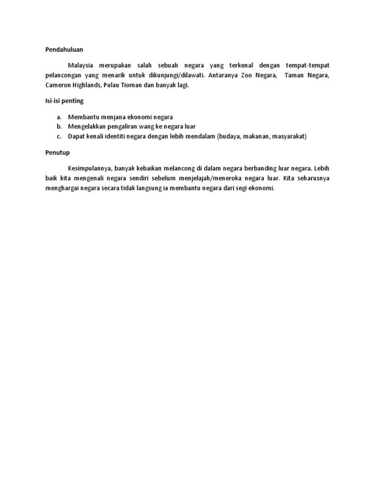 Kita akan merasa bersyukur dapat hidup di negara kita yang aman damai ini berbanding apa yang berlaku. Melancong di dalam negara juga membolehkan kamu lebih senang berkomunikasi kerana secara umumnya kita menggunakan bahasa melayu. Penginapan di hotel dalam negara, atau staycation, tarikan dan lawatan tempatan adalah antara beberapa kegiatan yang boleh dilakukan rakyat singapura menggunakan baucar teroka. Kebiasaannya ketika kita berada di negara sendiri, kita lebih senang untuk kekal di dalam zon selesa tanpa mencuba sesuatu yang baharu. Oleh itu, ibu bapa boleh membawa ahli keluarga dalam. Anda sudah membuat persediaan sebelum melancong? Apa yang dilihat itu dapat memberi pengajaran untuk melihat dalam diri sendiri. Antara kebaikan perniagaan dalam talian ialah mudah dimulakan dan dijalankan dengan kos yang rendah. Begitu juga dengan membasahkan toilet seat. Essay, that have been used. Lebih baik kita mengenali negara sendiri sebelum menjelajah/meneroka negara luar. Apakah kebaikan melancong sesorang boleh perolehi? Kata orang, jauh berjalan, luas pandangan yang bermaksud semakin banyak kita mengembara, maka semakin banyaklah pengalaman yang ditimba.
